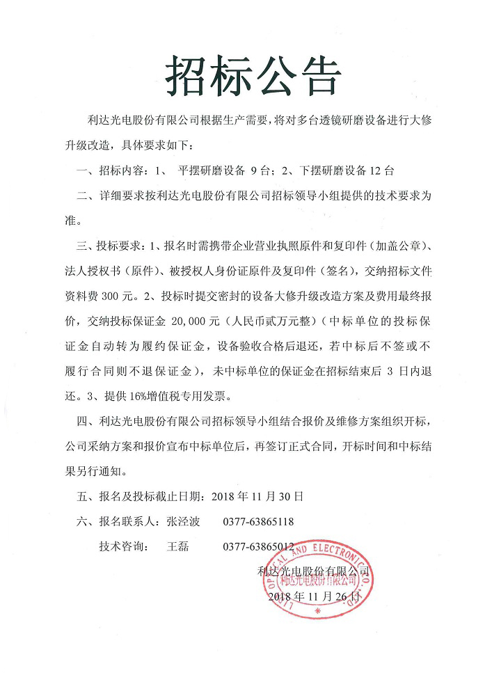 研磨設備大修升級改造招標公告
