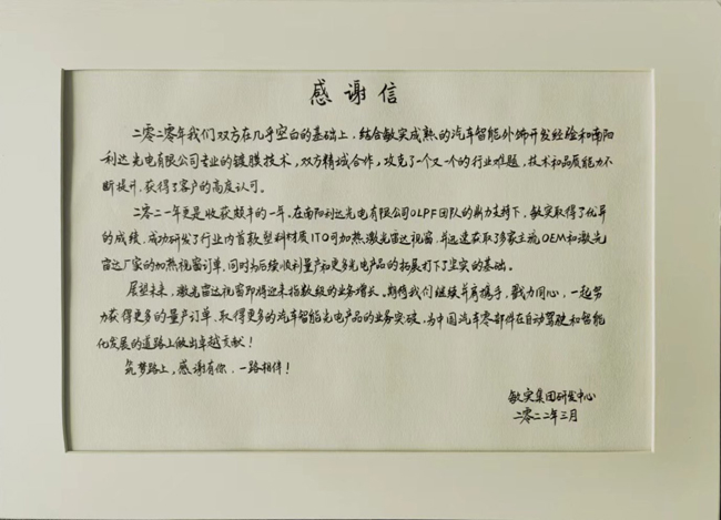 | 敏實集團研發(fā)中心感謝信 |